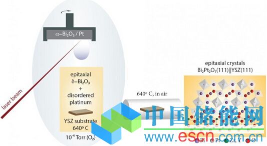該團(tuán)隊(duì)使用脈沖激光沉積技術(shù)共沉積外延的δ-Bi2O3和無序的金屬鉑。薄膜在空氣中退火,使得鉑被氧化,形成長度約100納米的外延Bi2Pt2O7晶體。