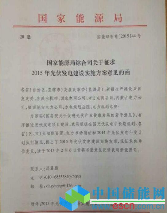 中國(guó)儲(chǔ)能網(wǎng)訊:2015年1月26日,國(guó)家能源局向各省(自治區(qū)、直轄市)發(fā)改委(能源局)、新疆生產(chǎn)建設(shè)兵團(tuán)發(fā)改委,各派出機(jī)構(gòu),國(guó)家電網(wǎng)公司、南方電網(wǎng)公司,內(nèi)蒙古電力公司,陜西地方電力公司,水電規(guī)劃總院、電力規(guī)劃總院下發(fā)了《國(guó)家能源局綜合司關(guān)于征求2015年光伏發(fā)電建設(shè)實(shí)施方案意見(jiàn)的函》。國(guó)家能源局根據(jù)全國(guó)光伏發(fā)電中長(zhǎng)期規(guī)劃、各省(區(qū)、市)太陽(yáng)能資源、電力市場(chǎng)消納和2014年光伏發(fā)電年度計(jì)劃執(zhí)行情況,提出了2015年光伏發(fā)電建設(shè)實(shí)施方案,征求以上各單位意見(jiàn),并要求于2015年2月6日前將書(shū)面意見(jiàn)反饋至國(guó)家能源局新能源司。