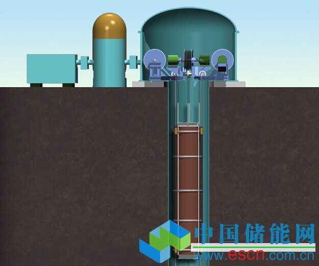 設(shè)計原理十分簡單,提升重物(或者使用壓縮空氣抬高重物)來存儲能量,重物下落帶動渦輪機(或者釋放壓縮空氣驅(qū)動氣動馬達)釋放能量。