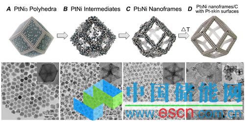 研究發(fā)現(xiàn),在溶液中的起始材料——固態(tài)晶體PtNi3多面體會(huì)轉(zhuǎn)變?yōu)镻tNi中間物質(zhì),然后通過(guò)內(nèi)部腐蝕,轉(zhuǎn)變?yōu)镻t3Ni納米框架,氧原子可以從中間通過(guò)。PtNi3多面體的棱邊由高濃度鉑組成,它在后來(lái)的Pt3Ni納米框架中也得到保留。最初的多面體由三個(gè)鎳原子和一個(gè)鉑原子構(gòu)成,最終的納米框架則正好相反。