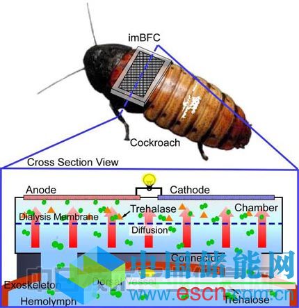 這種燃料電池以昆蟲體液(血淋巴)中含有的一種糖(海藻糖)為能量源來發(fā)電。電池由電極、儲(chǔ)存體液的容器以及刺入昆蟲體內(nèi)的針管構(gòu)成。容器內(nèi)有透析膜,通過分離和擴(kuò)散使體液從昆蟲體內(nèi)流入容器。然后,通過酶(海藻糖酶和變旋酶)將體液中的海藻糖分解、生成葡萄糖,再通過氧化還原反應(yīng),在陽極使葡萄糖氧化、在陰極產(chǎn)生氧氣,這樣就形成了電池。