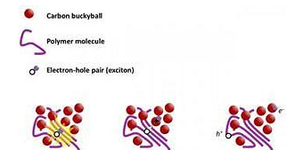 當(dāng)電池將光線吸入,光子在聚合物原子活動(dòng),令其溢出電子,遺留下一個(gè)空洞——科學(xué)家們稱之為“空穴”。空穴與電子迅速形成“激子”(激發(fā)性電子)的結(jié)合體。隨后,激子分裂,獨(dú)立移向另一個(gè)光子創(chuàng)造出來的空穴中。激子這類從一個(gè)空穴移向另一個(gè)空穴的持續(xù)行動(dòng)產(chǎn)生電流。