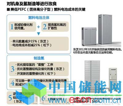 東芝公司于2009年上市了PEFC型ENE-FARM,之后于2012年3月推出了新機(jī)型。通過(guò)提高鉑催化劑等的性能,使貴金屬催化劑的使用量減少了20%。并且,還通過(guò)提高氫和氧的擴(kuò)散性,提高了單元的發(fā)電效率,將單元數(shù)量減少了15%。將所發(fā)電力從直流電轉(zhuǎn)變?yōu)榻涣麟姷哪孀兤?功率調(diào)節(jié)器)也與控制電路板實(shí)現(xiàn)一體化,減少了部件個(gè)數(shù)。并改進(jìn)了系統(tǒng)整體設(shè)計(jì),使成本削減了3成。