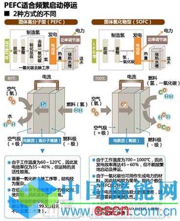 不過(guò),SOFC由于工作溫度較高,因此要保持能源效率,需要一直處于運(yùn)轉(zhuǎn)狀態(tài)。另一方面,PEFC由于工作溫度較低,因此從啟動(dòng)到發(fā)電用時(shí)較短,也可頻繁啟動(dòng)及停運(yùn)。東芝燃料電池系統(tǒng)公司董事永田裕二說(shuō):“從實(shí)際使用情況考慮,PEFC和SOFC在效率方面相差無(wú)幾?!?