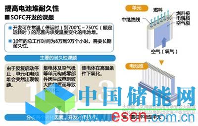 日本大阪燃?xì)夤?、?ài)信精機(jī)公司和京瓷公司合作,于2012年3月共同開(kāi)發(fā)出SOFC型ENE-FARM,并于4月上市。開(kāi)發(fā)時(shí)所面臨的最大課題,就是確保電池堆的耐久性。由于SOFC工作時(shí)的溫度高達(dá)700℃左右,因此隨著溫度的變化,有時(shí)單元會(huì)出現(xiàn)裂縫。大阪燃?xì)獾葘?duì)這種情況進(jìn)行了改良。還有一個(gè)問(wèn)題,就是如果從單元中提取電力的集電體因氧化而劣化,電阻會(huì)隨之而增大。因此采取了對(duì)集電體表面進(jìn)行涂布加工等對(duì)策。