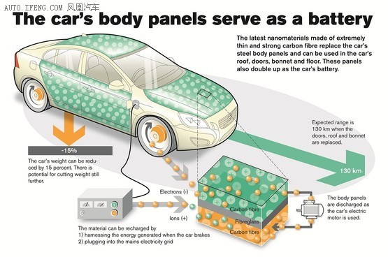 沃爾沃所參與開(kāi)發(fā)的新材料由碳纖維、聚合樹(shù)脂以及納米結(jié)構(gòu)電池組成。該材料的使用,可使車身和車內(nèi)零部件成為儲(chǔ)電設(shè)備。