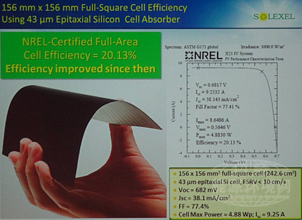 SOLEXEL是成立于2007年的風(fēng)險(xiǎn)企業(yè),擁有約50名員工。該公司副總裁Pawan Kapur稱:“這是本公司第一次介紹詳細(xì)的制造方法。”制造方法為,首先在基板上形成多孔硅膜,在其上通過(guò)外延生長(zhǎng)形成光吸收層——單晶硅膜(膜厚為43μm);然后,在形成鋁等金屬膜后,用激光制作圖案形成電極;最后重疊柔性材料,從基板上剝離外延硅膜及其上面的部分?;宕蛩阒貜?fù)利用。電池單元的尺寸與標(biāo)準(zhǔn)的結(jié)晶硅型太陽(yáng)能電池相同,為156mm見(jiàn)方。