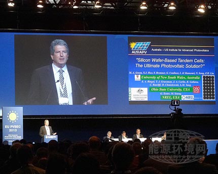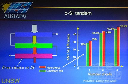 格林演講題目為“以硅晶圓為基材的串聯(lián)電池單元或成為終極光伏發(fā)電解決方案”(Silicon Wafer-Based Tandem Cells: The Ultimate Photovoltaic Solution?),他提出的方法是在硅上形成其他材料制成串聯(lián)結構。格林表示,只用硅材料時,電池單元轉換效率存在極限,只能達到29%,而在硅上重疊其他材料則可達到42.5%,如果在上面再重疊其他材料還可進一步達到47.5%。