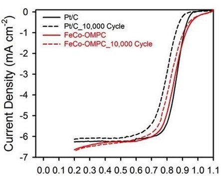 在一系列M-OMPC催化劑中,摻有鐵和鈷的FeCo-OMPC表現(xiàn)出了極高的酸性條件下的催化氧還原反應(yīng)的能力。它不但是非貴金屬催化劑中性能最好的,而且在0.9V電壓的條件下,它的性能甚至還超過(guò)了常規(guī)的鉑/碳催化劑80%以上。另外,相比鉑/碳催化劑,F(xiàn)eCo-OMPC還表現(xiàn)出了優(yōu)秀的耐久性能和甲醇抵抗力。這首先因?yàn)镕eCo-OMPC比較難于和氧氣發(fā)生反應(yīng),也因?yàn)樵摯呋瘎┚哂懈蟮谋砻娣e。