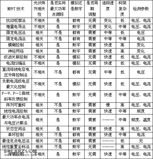 在光伏發(fā)電系統(tǒng)的效率計(jì)算中光伏轉(zhuǎn)換效率比重很大,如果不妥善解決,會(huì)導(dǎo)致整體效率下降轉(zhuǎn)換效率決定于轉(zhuǎn)換系統(tǒng)的工作點(diǎn),最大功率點(diǎn)跟蹤(MPPT)控制能夠使工作點(diǎn)處于最優(yōu)位置,改善轉(zhuǎn)換效率,減少發(fā)電成本,是目前應(yīng)用比較成熟的技術(shù)。一個(gè)比較好的MPPT控制要做到5點(diǎn):快速、高效、獨(dú)立、準(zhǔn)確、低價(jià)。這些特點(diǎn)可以用來對當(dāng)前使用的MPPT的幾種算法進(jìn)行評(píng)價(jià),如下表所示。