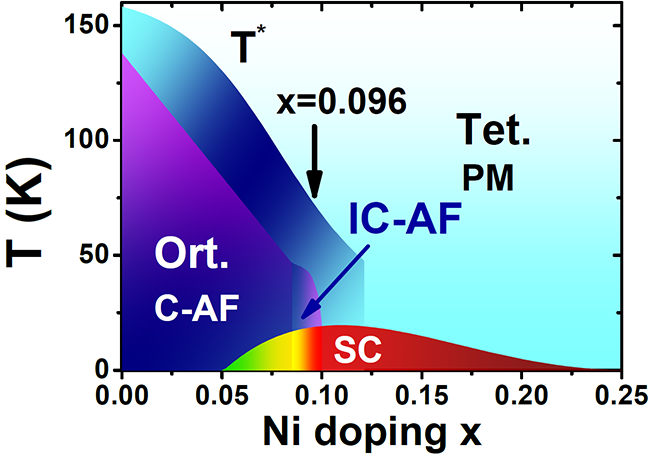 圖1. BaFe2-xNixAs2電子態(tài)相圖,其中T*為平面內(nèi)電阻各向異性消失溫度,箭頭所指為測量樣品摻雜點。
