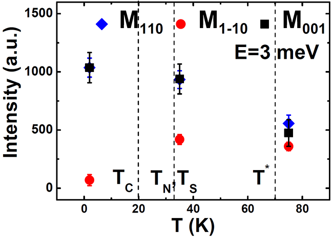 圖3. E=3meV處自旋激發(fā)的各向異性一直持續(xù)到遠高于TN和Ts的T*溫度,并在Tc以下的超導態(tài)增強。