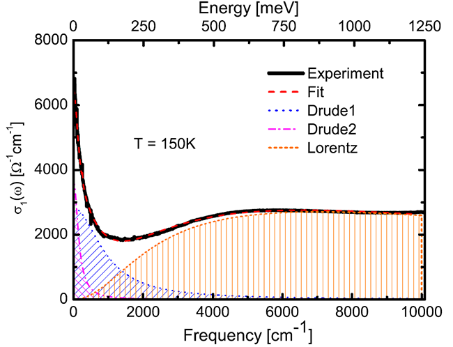 圖2 光電導(dǎo)曲線可以分解為一個(gè)寬的Drude, 一個(gè)窄的Drude (分別代表兩種具有不同散射率的載流子), 和Lorentz項(xiàng) (表示帶間躍遷)。