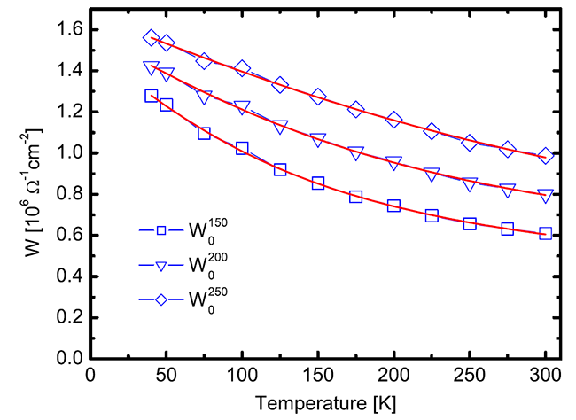 圖4 低頻光電導(dǎo)譜權(quán)重隨溫度的變化曲線。3個(gè)不同截止頻率對(duì)應(yīng)的曲線都滿足arctan(T)的關(guān)系。