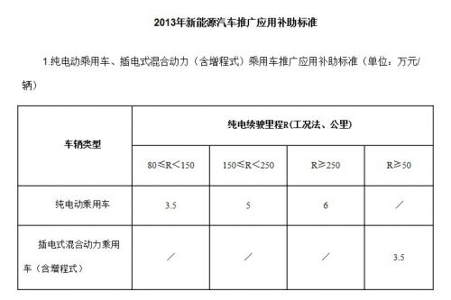 (四)補助標準。補助標準依據(jù)新能源汽車與同類傳統(tǒng)汽車的基礎差價確定,并考慮規(guī)模效應、技術進步等因素逐年退坡。2013年具體補助標準見附件。2014年和2015年,純電動乘用車、插電式混合動力(含增程式)乘用車、純電動專用車、燃料電池汽車補助標準在2013年標準基礎上分別下降10%和20%;純電動公交車、插電式混合動力(含增程式)公交車標準維持不變。