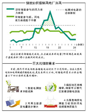 在風(fēng)電渦輪和太陽能板旁安裝儲能電站,可以幫助緩解這個(gè)矛盾。大風(fēng)天氣和陽光充沛的時(shí)段,它們可以向電網(wǎng)提供清潔并可循環(huán)利用的電能,然而到了無風(fēng)天氣和太陽下山后,需依靠可以儲存多余電能的儲能電站,來減少可再生能源的棄風(fēng)損失。
