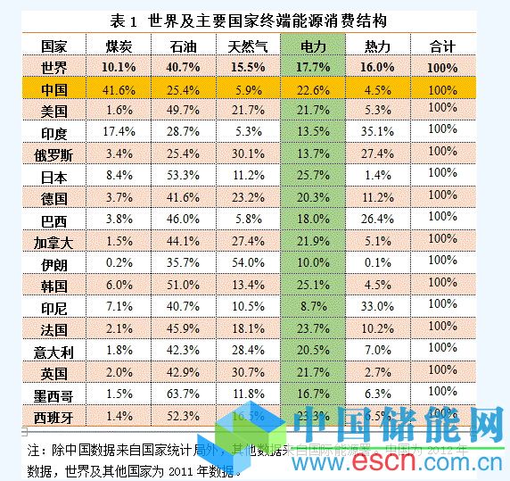 中國儲能網(wǎng)訊:電能占終端能源消費(fèi)的比重代表電力替代煤炭、石油、天然氣等其它能源的程度,是衡量一個(gè)國家終端能源消費(fèi)結(jié)構(gòu)和電氣化程度的重要指標(biāo)。電能是清潔、高效、便利的終端能源載體,在大力推進(jìn)低碳發(fā)展,大規(guī)模開發(fā)可再生能源,積極應(yīng)對氣候變化的全球發(fā)展趨勢下,提高電能占終端能源消費(fèi)比例已成為世界各國的普遍選擇。世界及主要國家終端能源消費(fèi)結(jié)構(gòu)如表1所示。