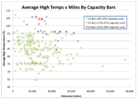 去年,PIA針對日產(chǎn)聆風的電池使用壽命做了調(diào)查,發(fā)現(xiàn)炎熱的氣候環(huán)境對其影響很大。當周圍環(huán)境溫度為95華氏度(約合35攝氏度)或更高時,聆風電池組的可用容量就損耗得十分嚴重(見下圖),大部分出現(xiàn)了15%-21%的電池容量損耗,嚴重的甚至下降21%-28%。美國亞利桑那州的日產(chǎn)聆風車主也證實了PIA的調(diào)查結(jié)果。