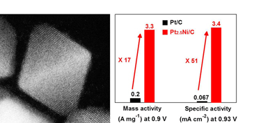 在為PEMFCs合成鉑鎳納米晶體時(shí),使用了一種“神奇溶劑”(本實(shí)驗(yàn)中使用的是二芐醚)。最后,得到了期待的八面晶體,同時(shí),活性表面的表面活性劑數(shù)量大幅減少。由UTM Power公司帶隊(duì)的邵民華(音)在測(cè)量后表示,“這些正八面體表面的質(zhì)量活性是傳統(tǒng)的鉑碳電化學(xué)催化劑的17倍。”