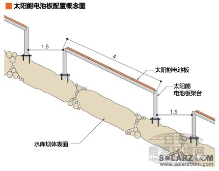 名為拋石護岸的堆石壩表面材料使用了大塊巖石。如果在巖石上打入基礎(chǔ)螺栓構(gòu)筑架臺,設(shè)置太陽能電池板,便可與壩體平行鋪設(shè)電池板。