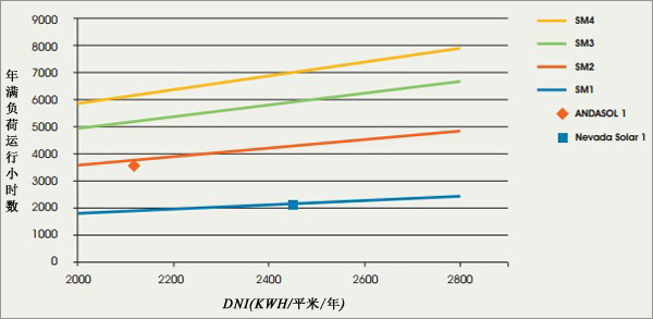 中國(guó)儲(chǔ)能網(wǎng)訊:光熱發(fā)電對(duì)太陽(yáng)輻照的要求較高,其基準(zhǔn)DNI要求為大于5kWh/m2/天的輻照強(qiáng)度。在一定的DNI下,solar multiple(太陽(yáng)倍數(shù))和capacity factor(容量因子)對(duì)一個(gè)光熱電站的設(shè)計(jì)至關(guān)重要。下圖1對(duì)太陽(yáng)倍數(shù)與DNI和滿負(fù)荷運(yùn)行時(shí)長(zhǎng)(決定了容量因子的大?。┑年P(guān)系進(jìn)行了分析: