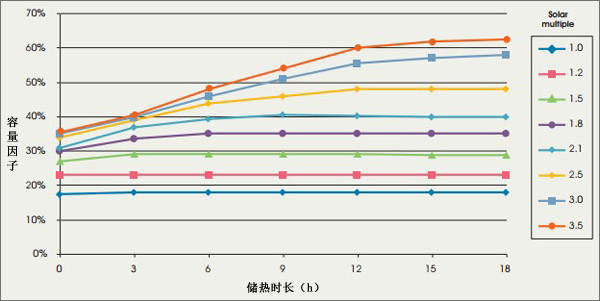 下圖2則展示了在不同的太陽(yáng)倍數(shù)下,容量因子和儲(chǔ)熱時(shí)長(zhǎng)的關(guān)系。圖1和圖2都表明,太陽(yáng)倍數(shù)越高,則容量因子越大,兩者成正相關(guān)。一定的太陽(yáng)倍數(shù)下,儲(chǔ)熱時(shí)長(zhǎng)也影響到容量因子的大小。