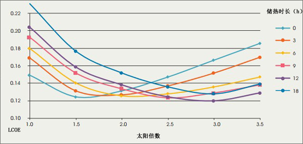 但太陽(yáng)倍數(shù)提高則會(huì)導(dǎo)致光場(chǎng)系統(tǒng)的投資上漲,從而導(dǎo)致LCOE升高,因此,太陽(yáng)倍數(shù)絕非越高越好,電站設(shè)計(jì)中需要在太陽(yáng)倍數(shù)和容量因子、LCOE、儲(chǔ)熱時(shí)長(zhǎng)中尋求平衡點(diǎn)。如圖3所示,表明了一個(gè)槽式電站理想的最低的LCOE的實(shí)現(xiàn)環(huán)境為:太陽(yáng)倍數(shù)為3,儲(chǔ)熱12小時(shí)。但同時(shí)我們也看到,太陽(yáng)倍數(shù)為1.5的無(wú)儲(chǔ)熱電站、太陽(yáng)倍數(shù)為2儲(chǔ)熱6小時(shí)的電站的LCOE與其相差并不太大,因此應(yīng)根據(jù)其他電站設(shè)計(jì)的實(shí)際要求來(lái)衡量?jī)?chǔ)熱等系統(tǒng)的設(shè)計(jì)。
