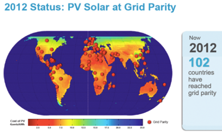 中國儲能網(wǎng)訊:尚德電力的首席技術官Stuart Wenham教授在近日舉辦的2013墨爾本太陽能會議的演講上公布了一幅有意思的地圖,顯示了目前太陽能光伏電站發(fā)電已經(jīng)可以實現(xiàn)平價上網(wǎng)的102個國家和地區(qū)。