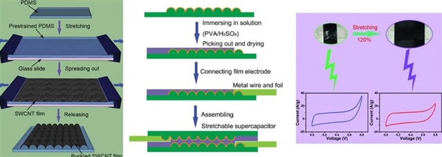 來自新加坡南洋理工大學(xué)的研究人員巧妙地利用卷曲的具有網(wǎng)狀結(jié)構(gòu)的單壁碳納米管(buckled Single-Walled Carbon Nanotube)膜結(jié)合具有優(yōu)異力學(xué)性能的H2SO4-PVA膠作為電解質(zhì)和隔膜,成功研制出具有超強(qiáng)伸縮性、高集成度的超級電容器(Supercapacitors)的儲能裝置,用于彌補(bǔ)彈性電子產(chǎn)品急需的能量來源。該研究工作發(fā)表在Advanced Materials上。