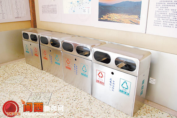 永定二中是全市較早開始做垃圾分類回收的學(xué)校。2001年,該校就設(shè)立了電池回收點(diǎn),并時(shí)常開展綠色環(huán)保的宣傳活動(dòng)。學(xué)校每年把收集起來的廢舊電池交與該縣的垃圾回收站。圖為該校教學(xué)樓門口的果殼箱,上面設(shè)立了電池回收專用孔。 記者 劉玉榮 攝