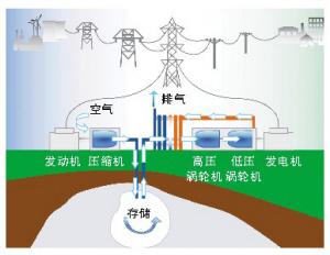空氣被泵入地下儲(chǔ)藏室(耗盡的天然氣井或鹽穴),并且在那里被存儲(chǔ)下來(lái)。直到需要時(shí),空氣經(jīng)過(guò)加壓從儲(chǔ)藏室中釋放出來(lái),用來(lái)驅(qū)動(dòng)發(fā)電機(jī)發(fā)電。