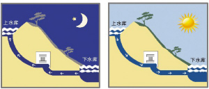 人們迫切需要其他技術(shù)。抽水蓄能逐漸受到重視,成為目前大規(guī)模儲(chǔ)存電能的主要手段。它的運(yùn)用原理很簡(jiǎn)單,在有高度落差的兩個(gè)地點(diǎn)分別建造兩座水庫(kù),用電量需求低時(shí),開動(dòng)水泵將水從位置低的水庫(kù)(下水庫(kù))抽到位置高的水庫(kù)(上水庫(kù)),將剩余能量轉(zhuǎn)換為重力勢(shì)能儲(chǔ)存;當(dāng)用電量激增時(shí),上水庫(kù)放水,水借助地勢(shì)差沖向下水庫(kù),推動(dòng)發(fā)電機(jī)組發(fā)電。