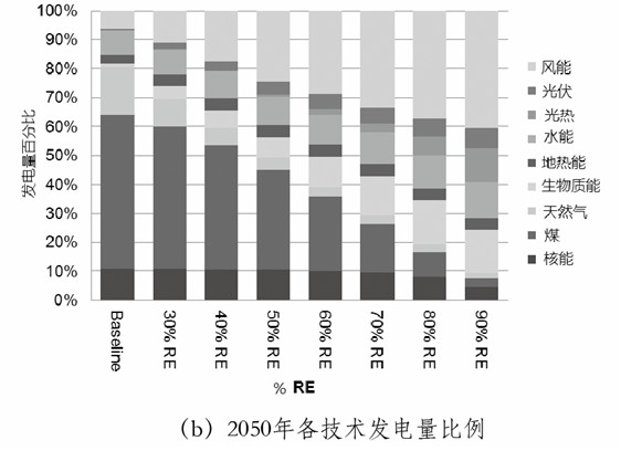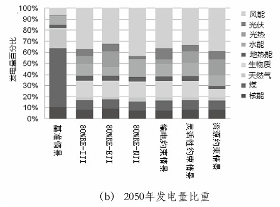 美國(guó)可再生能源發(fā)展受很多因素制約,包括政策與制度制約、技術(shù)發(fā)展水平、市場(chǎng)驅(qū)動(dòng)因素等等。對(duì)未來(lái)可再生能源發(fā)展進(jìn)行準(zhǔn)確估計(jì)較為困難,為此《前景研究》設(shè)計(jì)十幾種情景方案進(jìn)行分析??紤]到未來(lái)可再生能源發(fā)電量比重在80%的可能性較大,《前景研究》在情景分析時(shí)分別考慮了技術(shù)發(fā)展水平、條件限制以及需求情況等因素制約。