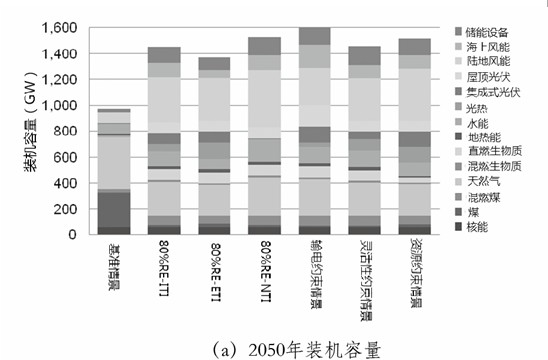 80%RE-NTI、80%RE-ITI與80%RE-ETI這三種情景主要側(cè)重于目前較為前沿的發(fā)電技術(shù)——太陽(yáng)能發(fā)電。從圖2可以看出,在80%RE-ETI情景中,光熱發(fā)電發(fā)展迅速,裝機(jī)達(dá)到1.3億千瓦,而水電與風(fēng)電相對(duì)其他情景較低,僅為0.81億千瓦與3.9億千瓦;80%RE-NTI情景主要依賴目前較為成熟技術(shù),風(fēng)電與水電裝機(jī)增加較快,分別達(dá)到5.6億千瓦與1.7億千瓦,而光熱裝機(jī)僅100萬(wàn)千瓦,規(guī)模光伏也僅達(dá)到500萬(wàn)千瓦。