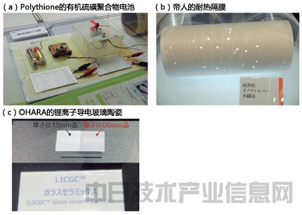 Polythione展示了使硫磺形成聚合物的硫磺電池(a)。帝人參考展示了耐熱性出色、電解液易于注入的隔膜(b)。OHARA公開了厚度僅0.05mm的鋰離子導(dǎo)電玻璃陶瓷(c)。