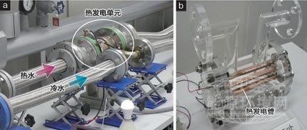 溫差為80℃時(shí),內(nèi)置10根200mm長熱發(fā)電管的一個(gè)熱發(fā)電單元,估計(jì)可產(chǎn)生50W左右的電力(a )。(b)中是該單元的模型。構(gòu)造簡潔、沒有驅(qū)動(dòng)部分等,因此易于維護(hù)。