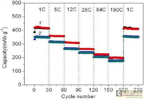 以單晶氧化釩與帶狀石墨烯作為鋰電池正極活性材料能夠在20秒內(nèi)實(shí)現(xiàn)完整的充電或放電過(guò)程。在以190C超高放電率狀態(tài)下循環(huán)1000次,電池仍能保持初始容量的90%,實(shí)驗(yàn)數(shù)據(jù)顯示這是迄今為止循環(huán)性能最佳的正極材料。