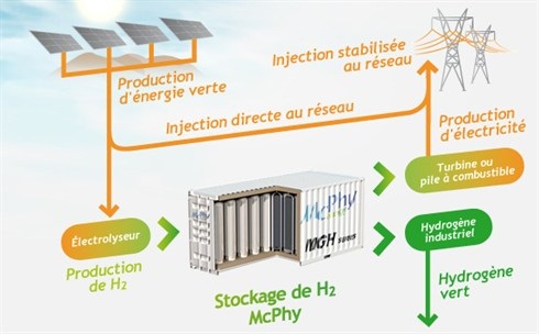 McPhy公司使用可再生能源如風(fēng)能或者太陽能產(chǎn)生電能,然后電解水制氫,氫氣將與鎂形成氫化鎂,然后儲存在特制的容器中,該過程穩(wěn)定且儲氫密度高。儲存壓力低于10bar,方便運(yùn)輸,具體案步驟如下圖所示。
