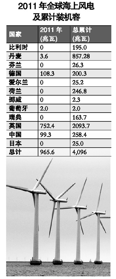 2011年共有235臺(tái)渦輪機(jī)組在九個(gè)風(fēng)電場實(shí)現(xiàn)了并網(wǎng),總?cè)萘窟_(dá)866.4兆瓦,為歐洲累計(jì)輸送了3813兆瓦的海上風(fēng)電。其中,87%的新增容量來自英國海域,德國安裝了108兆瓦,隨后是丹麥3.6兆瓦以及葡萄牙2兆瓦的實(shí)體漂浮式風(fēng)電機(jī)組原型。另有兩個(gè)低端漂浮式風(fēng)電機(jī)組原型在挪威和瑞典進(jìn)行了試驗(yàn)。