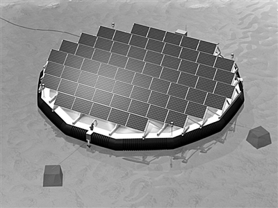用于太陽能發(fā)電的實驗室是個浮動圓形島,直徑為25米,安裝有100個光伏電池板,以45度的傾角逐一相連。