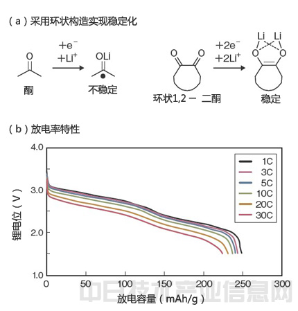 京都大學(xué)和松下開發(fā)出了正極材料采用將兩個(gè)酮連接形成環(huán)狀構(gòu)造的環(huán)狀1,2-二酮的有機(jī)充電電池(a)。支持30C的高速充放電(b)。
