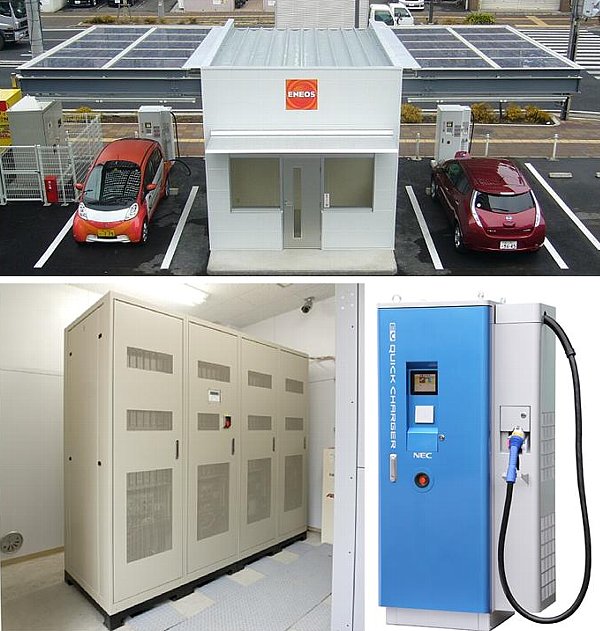實(shí)證實(shí)驗(yàn)所用BCIS由2臺(tái)額定輸出功率為50kW的快速充電器、NEC制造的額定輸出功率為64kWh的鋰離子蓄電池,以及受電變電裝置(起著變換器的作用)和負(fù)責(zé)充電管理的電力控制器組成。該系統(tǒng)于2011年末完成,目前正在位于橫濱市內(nèi)的吉坤能源的工廠內(nèi)邊向EV充電,邊進(jìn)行性能和可靠性驗(yàn)證(照片2)。
