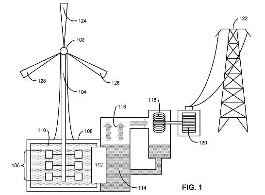 蘋果的理念其實(shí)相當(dāng)?shù)暮?jiǎn)單,風(fēng)力渦輪機(jī)驅(qū)動(dòng)轉(zhuǎn)子軸轉(zhuǎn)動(dòng),轉(zhuǎn)子軸再驅(qū)動(dòng)液體室里的設(shè)備。這一行為將加熱系統(tǒng)中的低熱容液體。該低熱容液體的能量可以保存并在需要的時(shí)候提供電力。