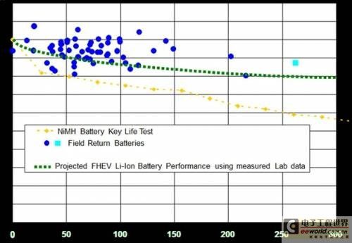 根據(jù)福特的調(diào)查,購(gòu)買(mǎi)混合動(dòng)力車(chē)潛在用戶對(duì)鋰電池可靠性的要求超過(guò)了其他17項(xiàng)因素,而“關(guān)鍵壽命試驗(yàn)”致力于此。福特電動(dòng)工程師Kevin Layton說(shuō):“在我們的測(cè)試中,鎳氫電池(福特翼虎混動(dòng)車(chē)中取出的,有一部分已使用了25萬(wàn)英里)的表現(xiàn)近乎完美。”在2004年推出的翼虎混動(dòng)曾在 加州組成混動(dòng)出租車(chē)隊(duì),總計(jì)已行駛了一億英里。福特之前已銷(xiāo)售了5000萬(wàn)個(gè)電池芯(cell),只有六個(gè)出現(xiàn)故障。這樣的低故障率也如實(shí)地在這個(gè)KLT 試驗(yàn)中得到了展現(xiàn)。因此,針對(duì)該試驗(yàn)結(jié)果,福特電動(dòng)工程師Kevin Layton說(shuō):“我們對(duì)鋰鐵電池性能超越鎳氫電池性能很有信心。”測(cè)試結(jié)果如下圖表,鋰鐵電池的衰減速度比鎳氫電池還要慢20%。