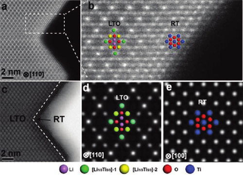 研究人員通過(guò)調(diào)控水熱反應(yīng)中Li:Ti投料比,合成出高質(zhì)量鈦酸鋰納米片負(fù)極材料(LTO-600)和側(cè)面包覆有金紅石TiO2的鈦酸鋰納米片負(fù)極材料(LTO-RT-600)。他們與中科院物理所和日本的科研人員合作,通過(guò)球差校正透射電子顯微鏡(STEM)直接觀察到原子級(jí)分辨的圖像,證明沿Li4Ti5O12 [001]方向上的確原位生長(zhǎng)出1納米厚的金紅石TiO2包覆層(圖1)。