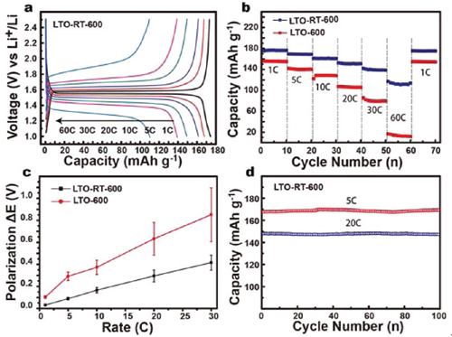 電化學(xué)性能測(cè)試表明,金紅石TiO2包覆后,鈦酸鋰負(fù)極材料的極化降低,比容量、高倍率性能和循環(huán)穩(wěn)定性顯著提高(圖2)。在1C條件下,其比容量為178 mA h g−1。即使在60C條件下,仍具有110 mA h g−1的比容量,比包覆前提高了10倍。為了揭示性能提高的原因,他們通過(guò)交流阻抗和Li擴(kuò)散系數(shù)測(cè)量發(fā)現(xiàn),金紅石TiO2包覆后,電極材料體系的界面電荷轉(zhuǎn)移阻抗降低了一半,Li的傳輸能力提高了10倍。仔細(xì)研究分析發(fā)現(xiàn),這一包覆的高效性在于金紅石TiO2僅存在于側(cè)面,并未完全包覆鈦酸鋰納米片,因此不會(huì)阻礙鋰離子沿Li4Ti5O12 [110]方向的傳輸。