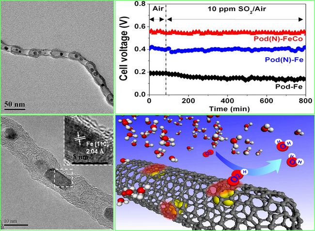 實(shí)驗(yàn)和理論研究進(jìn)一步證實(shí),在這一體系中,包裹納米金屬鐵的碳壁阻斷了反應(yīng)氣體與鐵納米粒子的直接接觸,從原理上避免了反應(yīng)過程中活性金屬鐵納米粒子的深度氧化,以及反應(yīng)氣氛中其它有害組分對(duì)催化劑的中毒,從而在根本上解決了納米金屬鐵作為燃料電池陰極催化劑的穩(wěn)定性難題。進(jìn)一步對(duì)包裹金屬納米粒子的碳壁進(jìn)行雜原子(如氮原子)摻雜和改變包裹其中的金屬納米粒子組分,對(duì)電極材料的催化性能起到明顯的調(diào)變作用。當(dāng)碳納米管管壁氮摻雜濃度為3.3 wt%,包裹Fe-Co納米合金時(shí),在完全相同的操作條件下,電池的功率密度可以達(dá)到以20%Pt-C催化劑的60%。特別是,在10 ppm的有害成分硫(SO2)存在時(shí),電池仍保持了優(yōu)異的活性和穩(wěn)定性。這一結(jié)果近期被《德國(guó)應(yīng)用化學(xué)》 (Angewandt Chemie International Edition, 2012, DOI: 10.1002/anie.201204958)在線發(fā)表。
