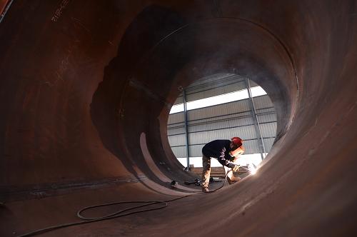 12月5日,江西洪屏抽水蓄能電站壓力鋼管制造廠,施工人員正在加緊施工。