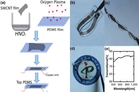 聚合物包埋的方法不需要引入離子液體等分散劑,也無需對碳管進行超聲分散處理,具有簡單易行、環(huán)保無損的優(yōu)點,非常適合直接生長的單壁碳納米管薄膜(Nano. Lett. 2007, 7, 2307)。研究人員制備出的彈性導體集碳納米管薄膜和彈性體聚合物的優(yōu)點于一身,具有很好的透光性、導電性和可拉伸性能:可見光透光率高達60%,同時面電阻只有幾十歐姆;在受到高達50%的反復拉伸應變時,可以保持良好的、穩(wěn)定的導電性。他們認為,如此好的可拉伸性能一方面來源于碳納米管獨特的一維特性,另一方面聚合物的引入可以有效地減弱應力集中、保持碳納米管薄膜在電學上的完整性。