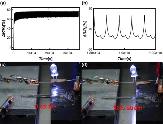 圖2 (a) CNT/PDMS透明彈性導體在反復拉伸應變下的電阻變化(拉伸500次);